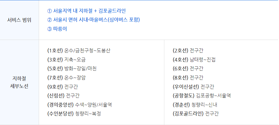 | 지원 범위 | 서울 지하철,버스 + 김포 골드라인 |