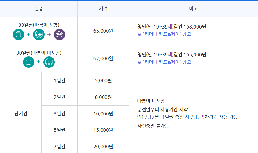 이용범위 : 서울지역 지하철 + 김포골드라인, 서울시 면허 시내,마을버스,따릉이