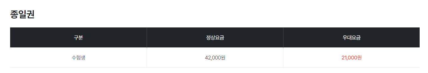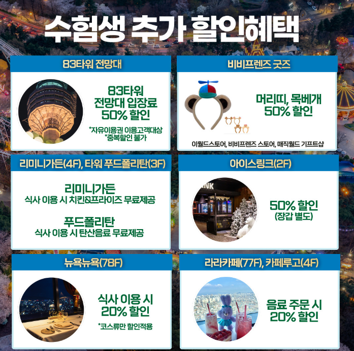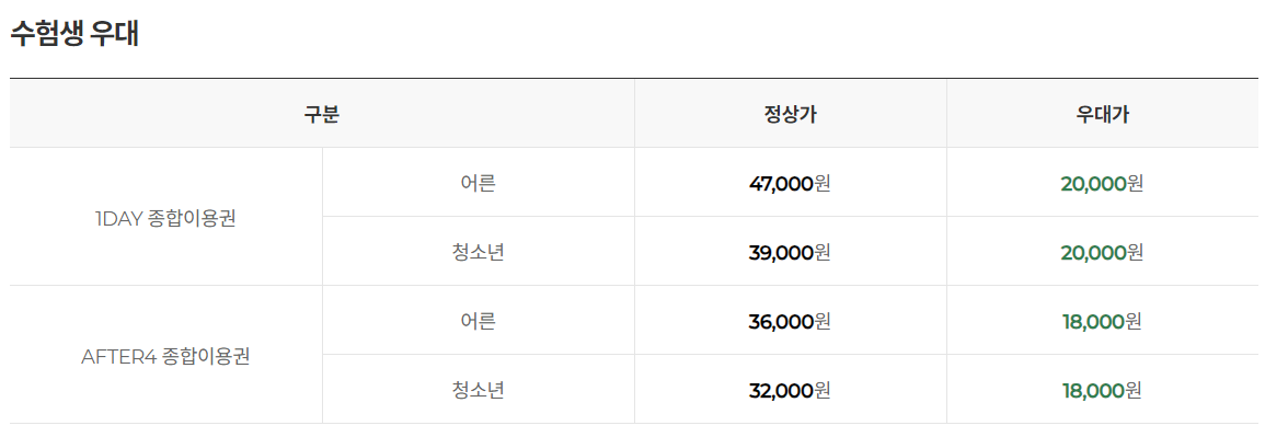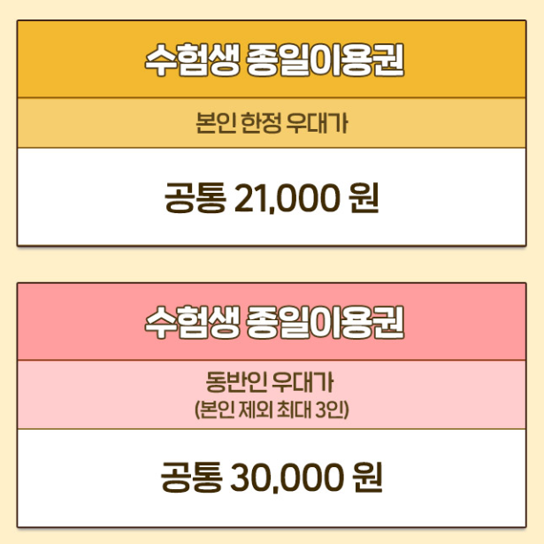 - 2025 수학능력시험 수험표/접수증/수시 합격증 원본 + 신분증(학생증, 청소년증 포함) 제시 시 동반 2인까지 할인 적용