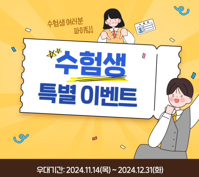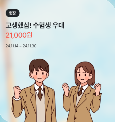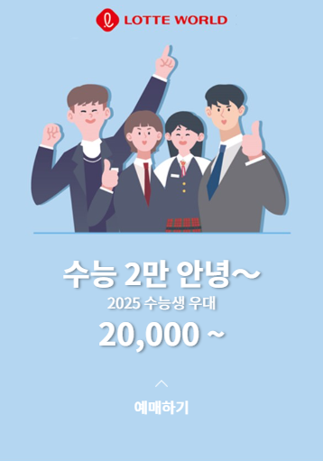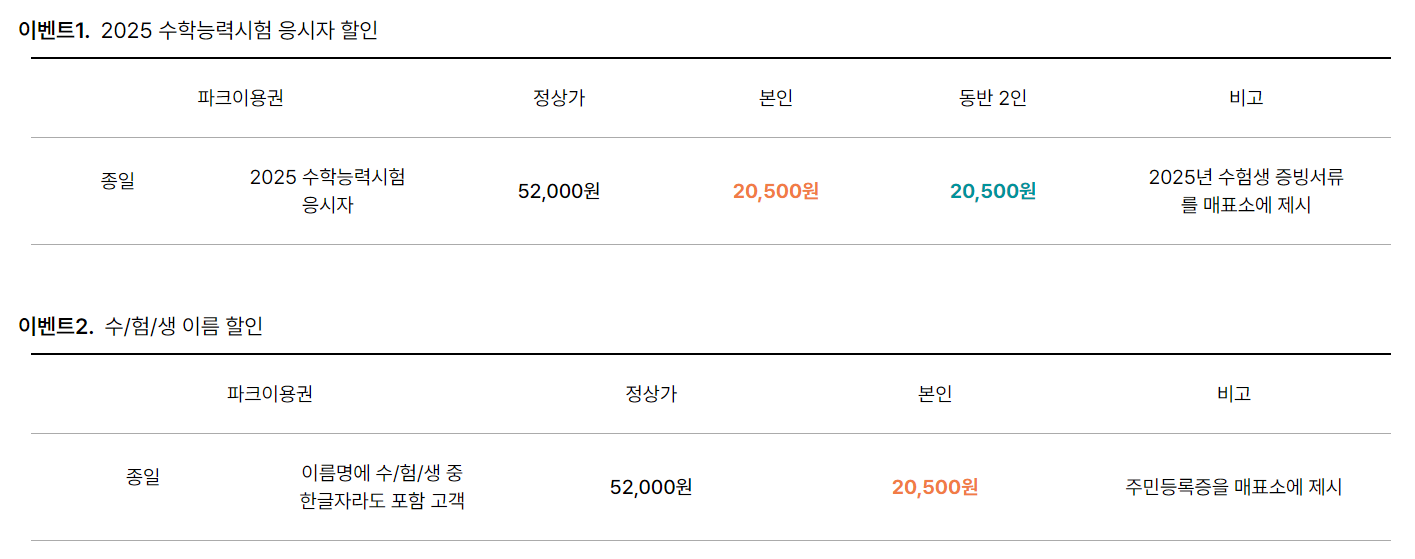 - 할인 대상 : 2025 수학능력시험 응시자(수험생)본인 + 동반 2인 or 이름명에 수/험/생 중 한글자라도 포함된 모든 고객