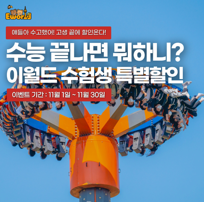 2025학년도 수능을 마친 수험생들을 위해 국내 유명 놀이동산들이 다양한 할인 혜택을 제공하고 있습니다. 우리 수험생들이 누릴 수 있는 할인 혜택과 놀이동산별 조건등을 소개합니다.